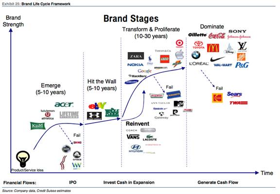 - understanding the brand lifecycle and key inflection points. Using case-study analysis of dozens of brand stories from the past century, Credit Suisse found that most brands follow a similar arc with five distinct stages: emerge, hit the wall, transform and proliferate, dominate, and reinvent. While early-stage brands are exciting and offer the highest potential return, they can be risky. However, companies transforming from niche player into a powerful brand that can proliferate across new markets and categories offer investors highly attractive returns, and this is also typically the brand lifecycle stage where the largest absolute market value is created.